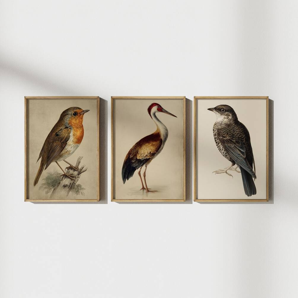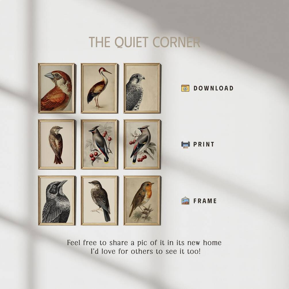 Transform your space with this stunning collection of nine vintage-inspired bird illustrations featuring diverse species in rich, earthy tones and classic ornithological detail. Each print showcases beautiful birds including robins, cranes, and songbirds with intricate plumage rendered in warm browns, deep reds, and soft grays. Perfect for creating a sophisticated gallery wall in your living room, study, or bedroom, this printable wall art set brings timeless natural elegance to any home decor style from cottagecore to modern farmhouse.