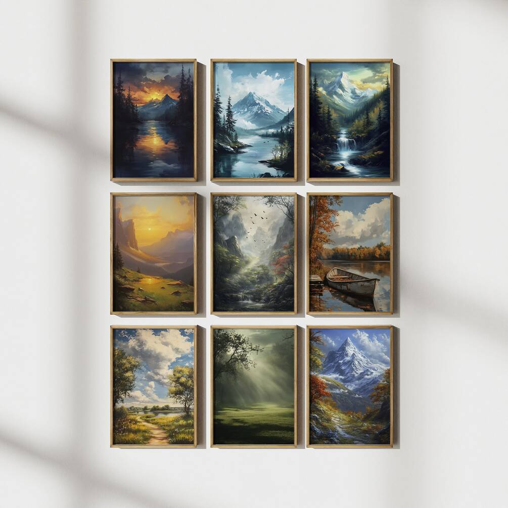 Transform your space with this stunning set of 9 vintage-inspired landscape prints featuring majestic mountain peaks, serene lakes, and golden autumn forests. These warm-toned artworks capture the timeless beauty of nature with dramatic lighting and rich seasonal colors. Perfect for creating a cozy gallery wall in your living room, bedroom, or cabin retreat. Each print evokes a sense of tranquility and rustic charm, making them ideal for farmhouse, cottagecore, or traditional home decor styles.