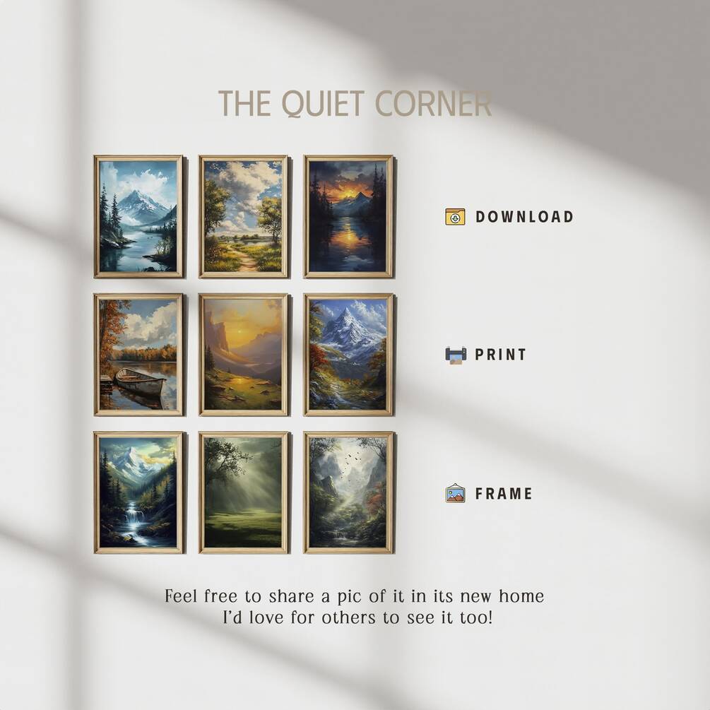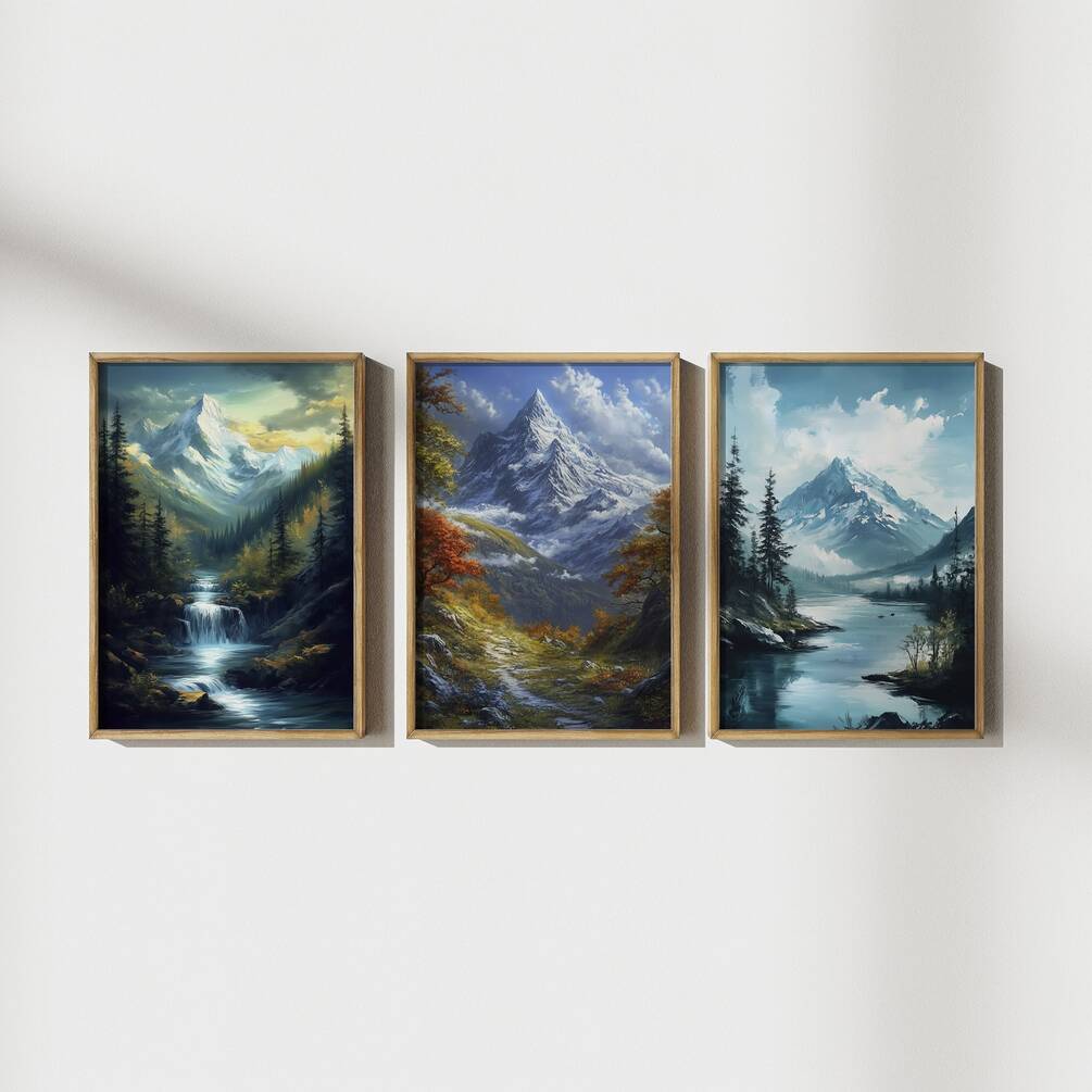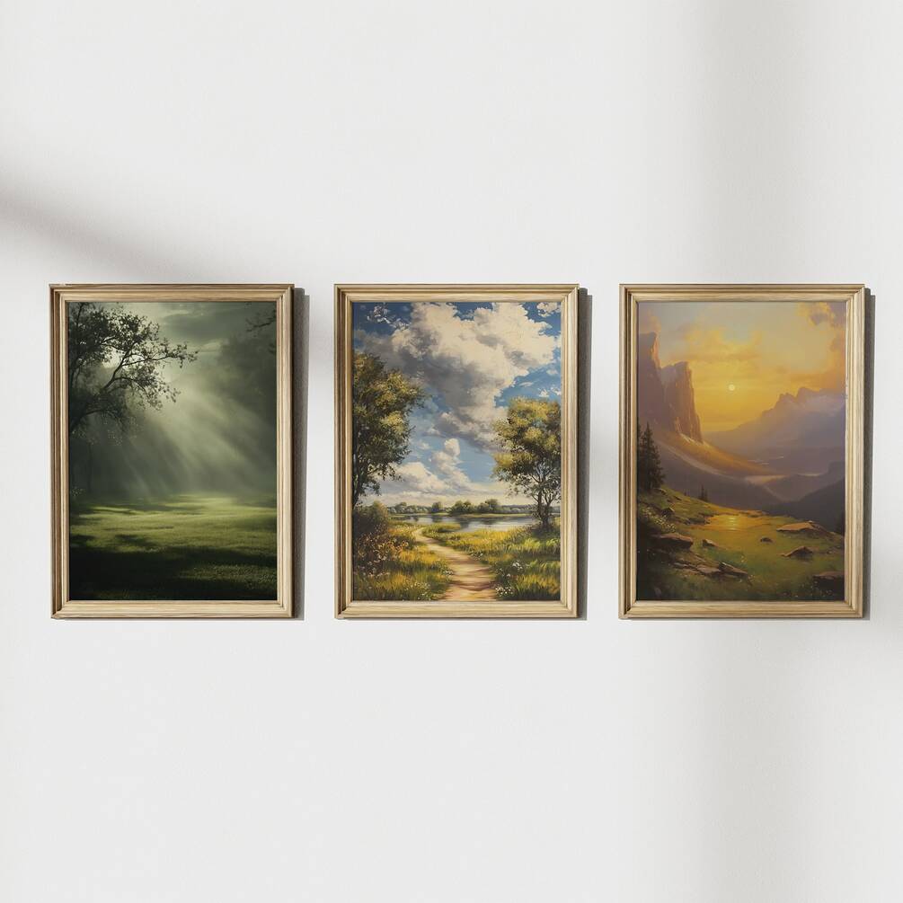 Transform your space with this stunning set of 9 vintage-inspired landscape prints featuring majestic mountain peaks, serene lakes, and golden autumn forests. These warm-toned artworks capture the timeless beauty of nature with dramatic lighting and rich seasonal colors. Perfect for creating a cozy gallery wall in your living room, bedroom, or cabin retreat. Each print evokes a sense of tranquility and rustic charm, making them ideal for farmhouse, cottagecore, or traditional home decor styles.