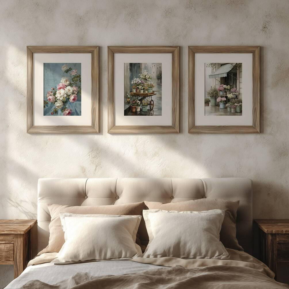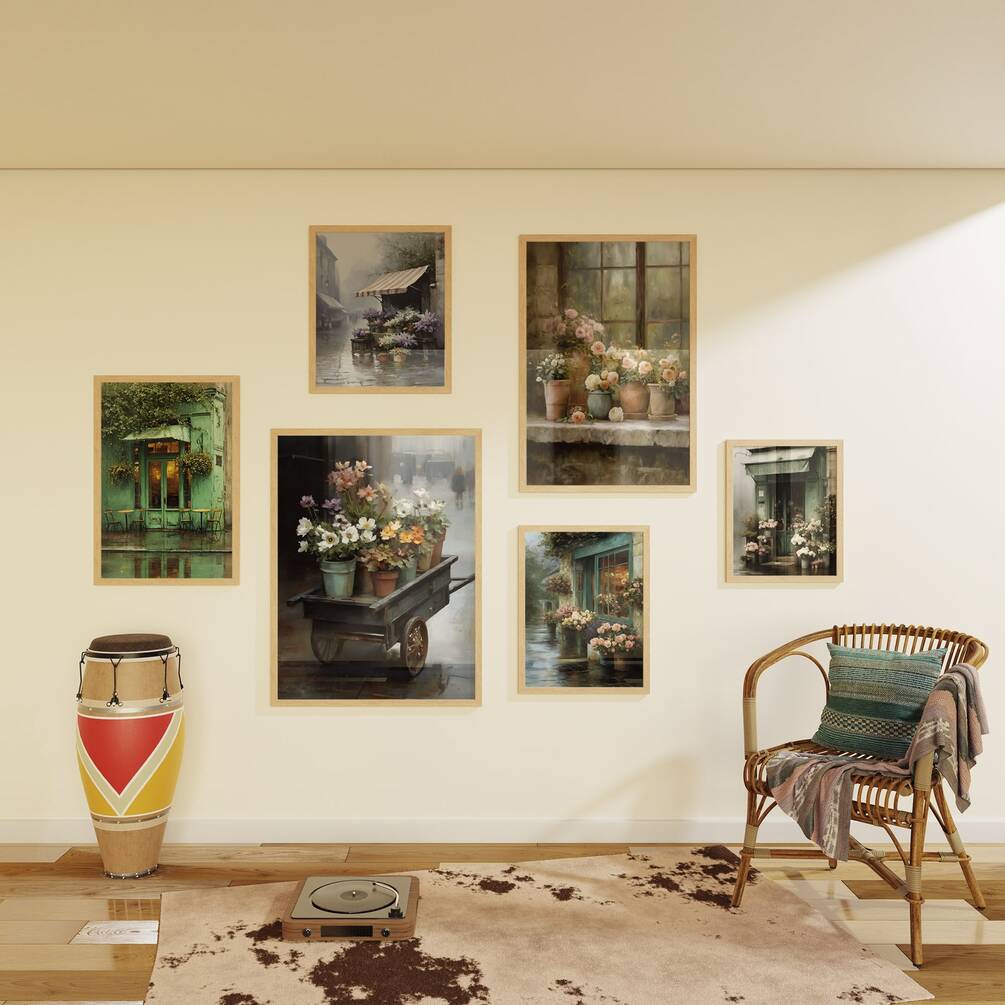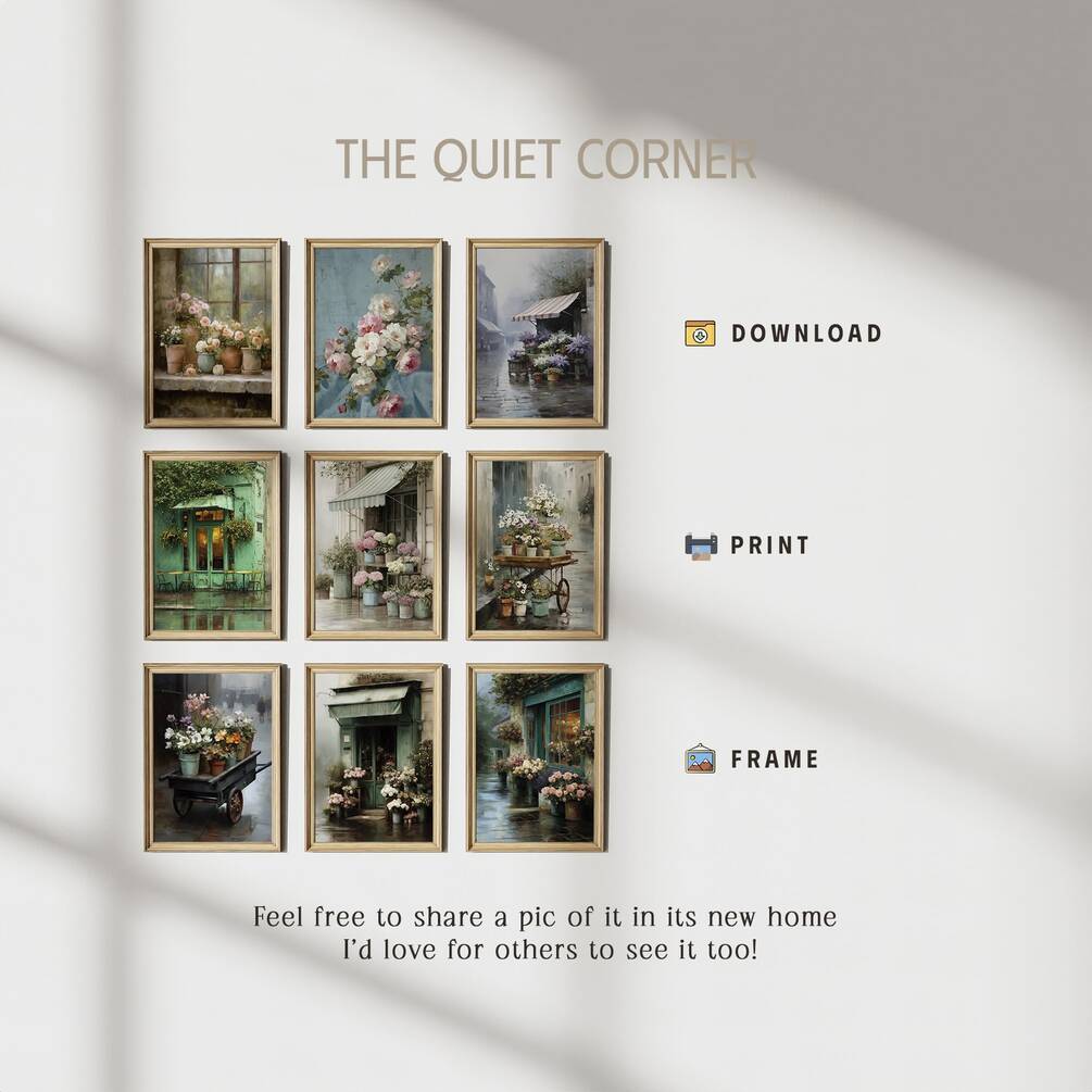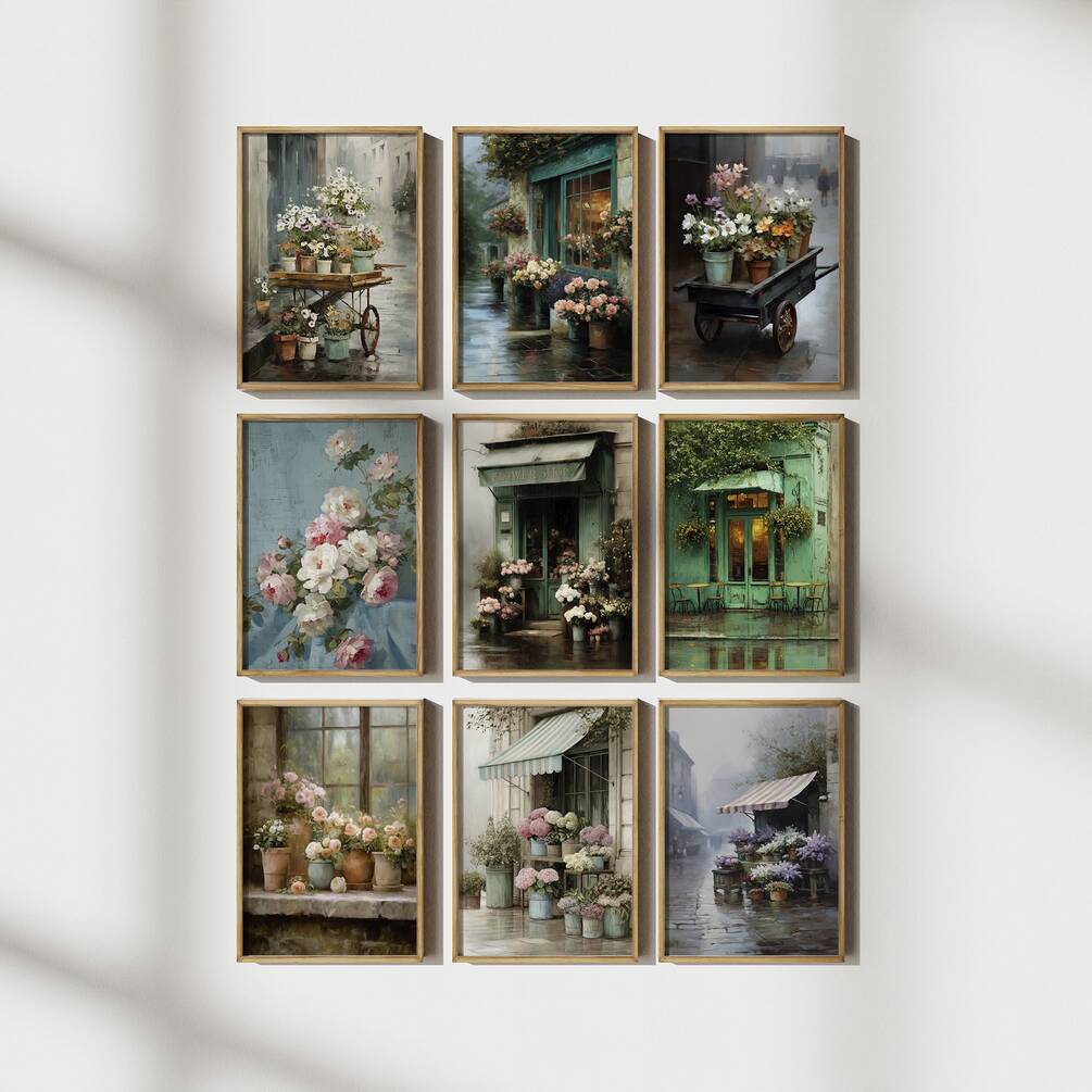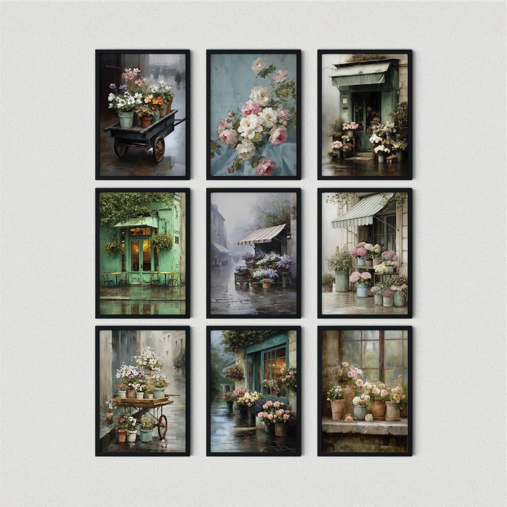 Create a stunning gallery wall with this enchanting set of 9 vintage floral market scenes featuring European flower shops, rustic wheelbarrows, and charming storefronts. Each piece captures the romantic essence of cottage garden aesthetics with soft roses, hydrangeas, and mixed blooms in weathered, muted tones. Perfect for farmhouse decor, cottagecore interiors, or creating a cozy vintage atmosphere in your living room, bedroom, or dining space. These printable wall art pieces bring timeless European charm and botanical elegance to any home.