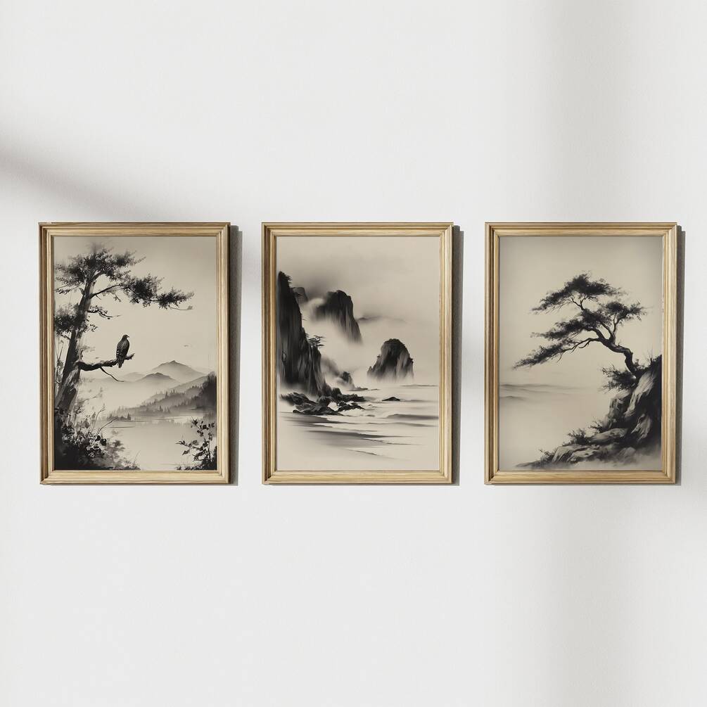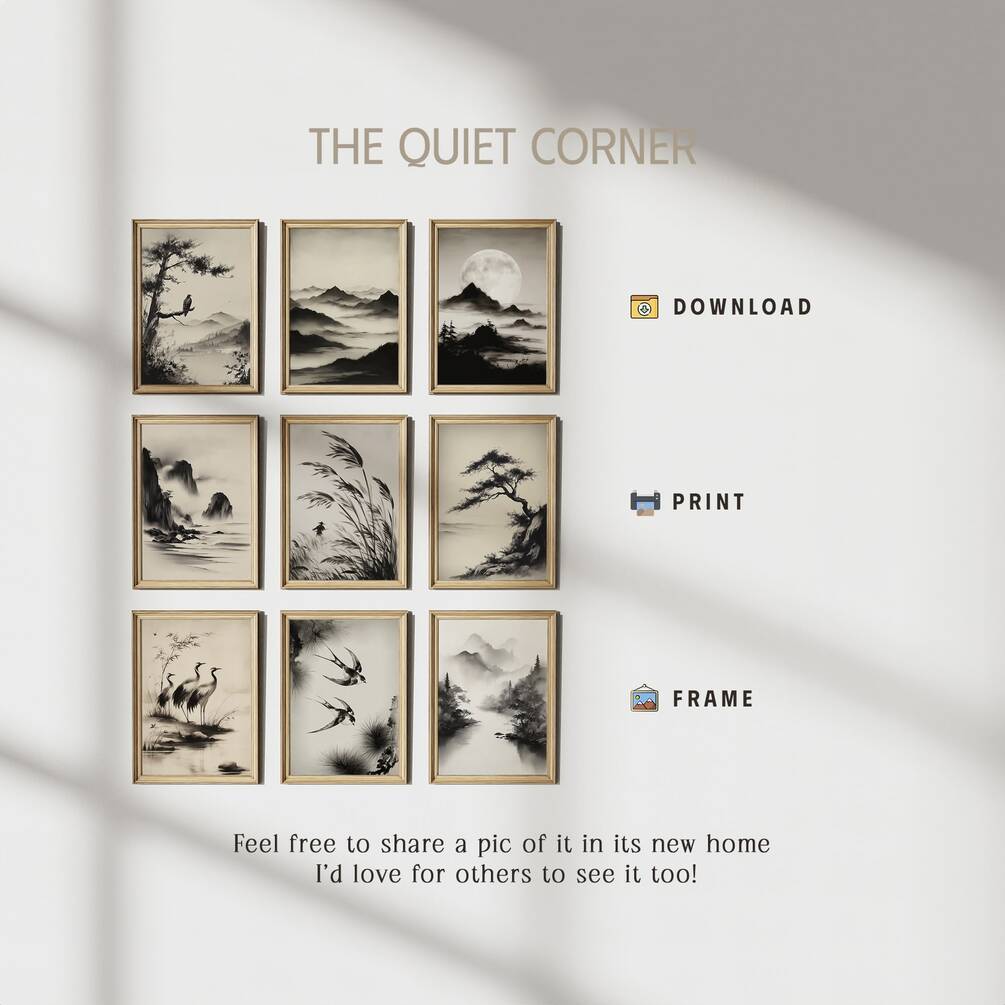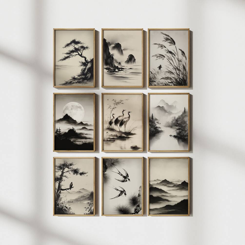 Transform your space with this elegant set of 9 Asian-inspired landscape prints featuring serene mountain scenes, graceful birds, and traditional ink painting aesthetics. These neutral-toned artworks in soft beiges and blacks create a calming, zen atmosphere perfect for modern farmhouse, minimalist, or bohemian decor. Ideal for creating a stunning gallery wall in your living room, bedroom, or meditation space, these timeless pieces also make thoughtful housewarming gifts for those who appreciate tranquil, nature-inspired art.