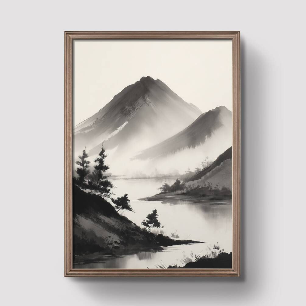 This serene collection of Japanese-inspired ink wash paintings captures the tranquil beauty of misty mountains, graceful birds perched on delicate branches, and peaceful lakeside scenes. The monochromatic palette of soft grays and warm beiges creates a calming, zen-like atmosphere perfect for creating a sophisticated gallery wall in your living room, bedroom, or meditation space. These minimalist nature prints bring timeless elegance to any home decor style, from modern to traditional, and make thoughtful gifts for art lovers who appreciate the quiet beauty of Asian-inspired artwork.