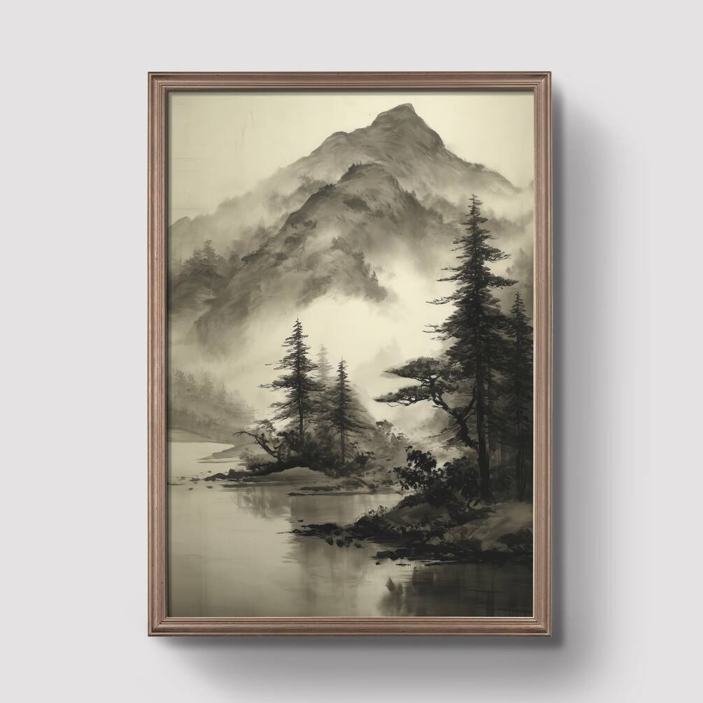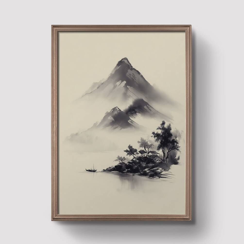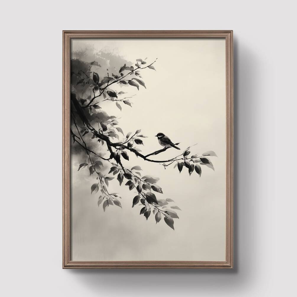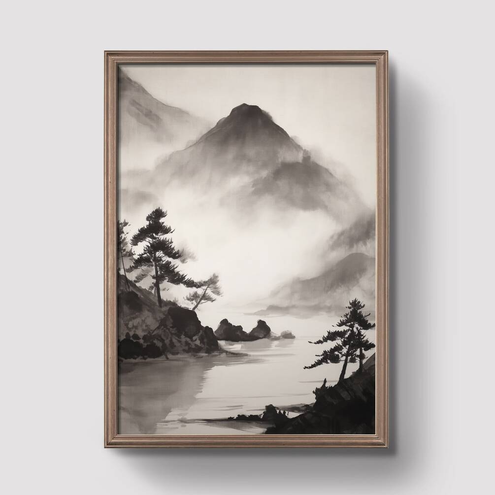 This serene collection of Japanese-inspired ink wash paintings captures the tranquil beauty of misty mountains, graceful birds perched on delicate branches, and peaceful lakeside scenes. The monochromatic palette of soft grays and warm beiges creates a calming, zen-like atmosphere perfect for creating a sophisticated gallery wall in your living room, bedroom, or meditation space. These minimalist nature prints bring timeless elegance to any home decor style, from modern to traditional, and make thoughtful gifts for art lovers who appreciate the quiet beauty of Asian-inspired artwork.