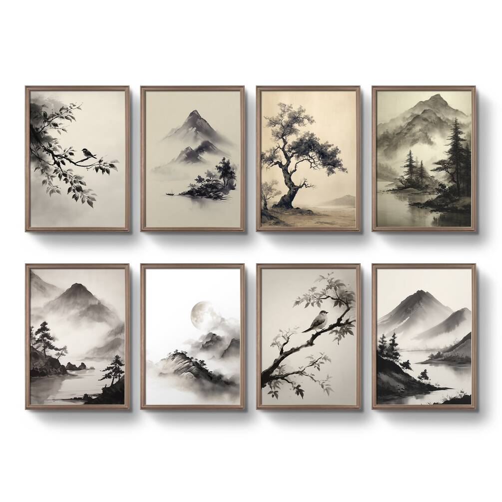 Set of 8 Japanese Ink Landscape, Mountain Nature, Minimalist Art, Bird Tree Prints, Zen Home Decor, Printable Gallery Wall | Digital Prints