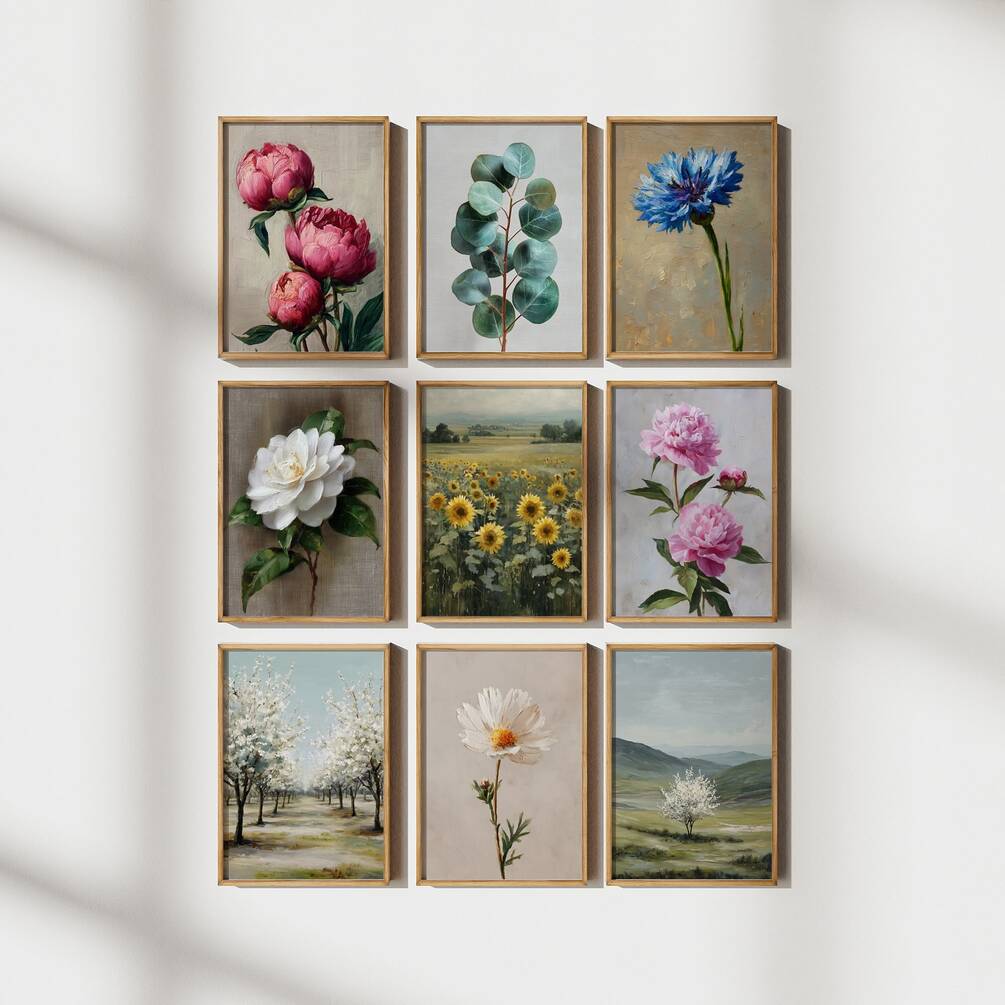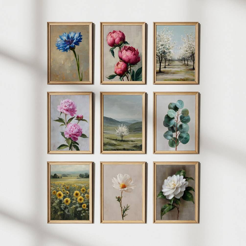 This charming vintage-inspired botanical art collection features nine beautifully painted prints showcasing delicate flowers and serene landscapes. The soft, muted color palette of blues, pinks, whites, and greens creates a calming, romantic atmosphere perfect for creating a stunning gallery wall. These timeless botanical and landscape prints bring natural beauty and vintage charm to any space, making them ideal for living rooms, bedrooms, nurseries, or as thoughtful housewarming gifts. Each piece captures the essence of spring and summer with classic floral motifs and peaceful countryside scenes.